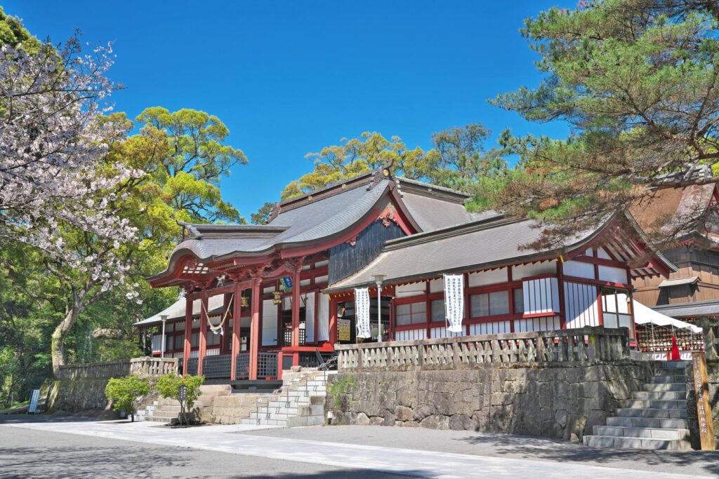 雄大な桜島を眺めるように、小高い丘に巨大な規模を誇る社殿が鎮座しています。海幸・山幸神話のヒコホホデミノミコトを祀っている鹿児島神宮は、大隅国一の宮であり、数少ない「神宮号」を名乗る神社です。もともとは桜島を祀った神社とも考えられ、中世~近世は八幡神を祀る「大隅正八幡宮」として栄えました。南九州最大の神社として昔から栄え続けた神社であり、境内及び周辺は「大隅正八幡宮境内及び社家跡」として国の史跡に指定されています。宝暦6年(1756)に建てられた現在の社殿は、九州最大級の大きさを誇り、内外に装飾があって国の重要文化財に指定されています。参拝するときに見える龍の彫刻や200以上の天井の植物絵は必見です。子どもの健やかな成長を祈る鯛車やぽんぱちといった、ここにしかないかわいいい伝統玩具も数多くあります。